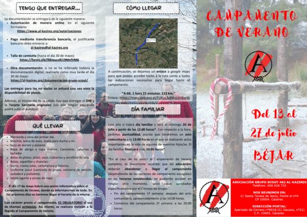 – Otra documentación: si no se ha rellenado todavía la documentación digital, realizarlo como muy tarde el día 30 de mayo: https://al-kazires.org/documentacion-grupo-scout/.